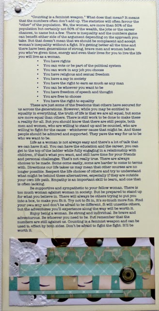 Then a few days later I found the time to make an additional 12x6 page for the journalling. As ever, I tried to ensure that there were a few elements of paper and embellishments to tie the two pages together into a coherent design. Finding the right words, however, was more difficult. I wanted to try to maintain some positive feelings, even though there is a little bit of negative in there. But most of all, I wanted to express my views on what I see is a realistic assessment on what it is to be a woman today. Not all good, but not all bad either.